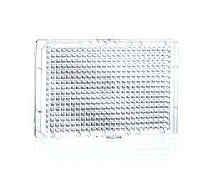 Standard polystyrene microplates are only partially suitable for transmission measurements in the UV. Polystyrene absorbs UV especially in the short-wavelength range (< 320 nm). μClear® microplates with a thin polystyrene film base already have much lower background values and can be used up to 340 nm without any problem. The adaptation of the patented μClear® process technology to a new, innovative UV-transparent material has made it possible to produce microplates that extend the transmission range up to 230 nm.