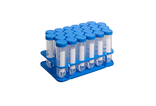 架装聚丙烯锥底离心管,50 mL,蓝色旋帽,自然色管身,有刻度线,白色书写区,灭菌,25个/架